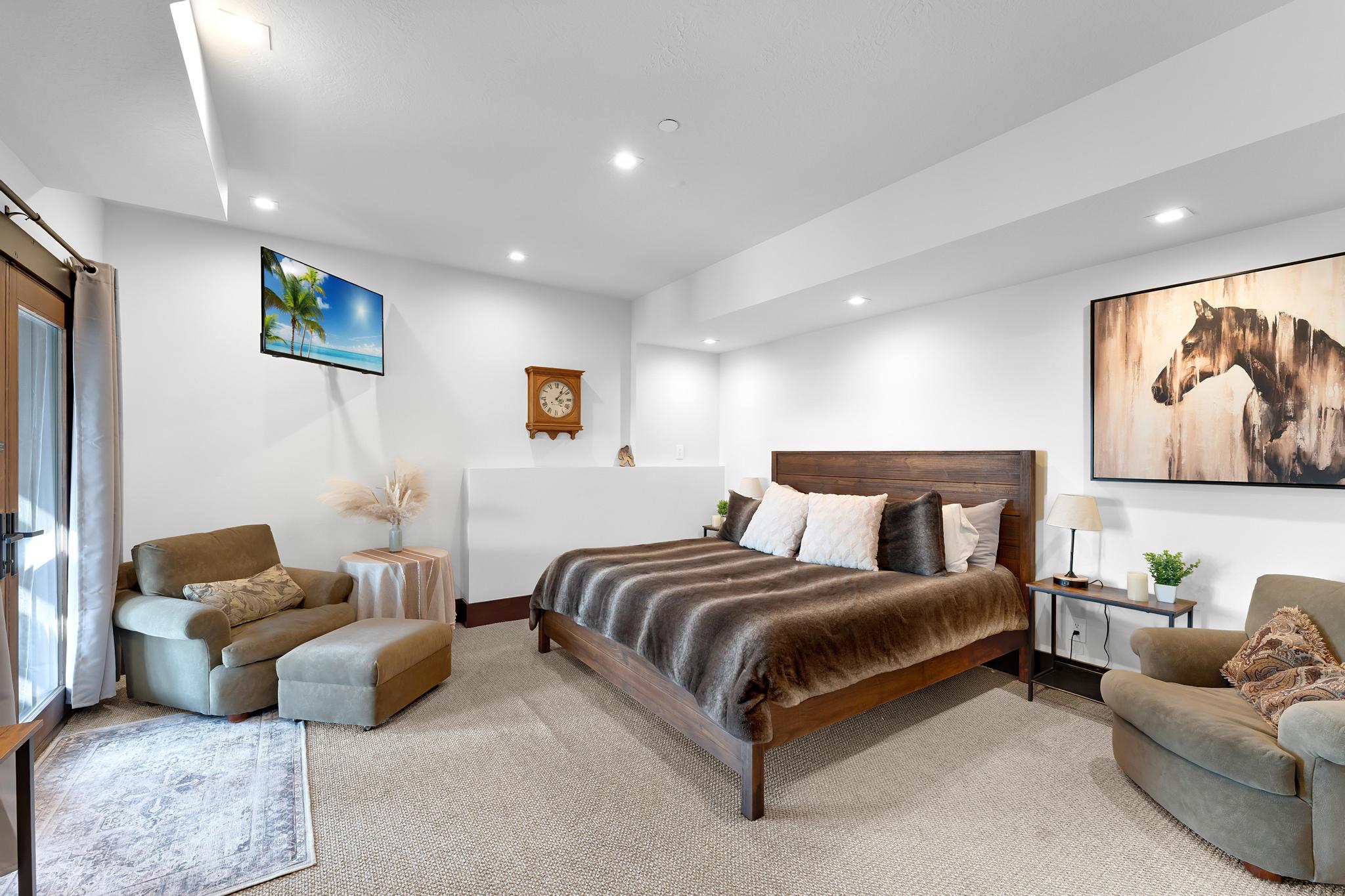 The primary suite features a private covered patio and a gas fireplace, ensuring the space remains comfortable year round. Other appealing upgrades include a walk-in closet with laundry hook-ups and an ensuite with a separate soaking tub and shower.